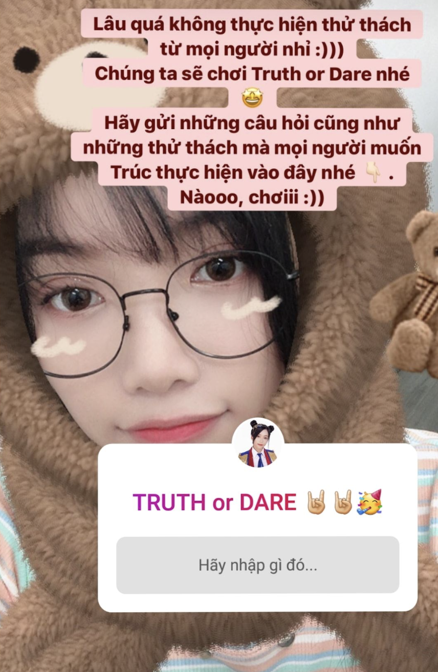 Lâu quá không thực hiện thử thách từ mọi người nhỉ :))) Chúng ta sẽ chơi Truth or Dare nhé 🤩 Hãy gửi những câu hỏi cũng như những thử thách mà mọi người muốn Trúc thực hiện vào đây nhé 👇🏻. Nàooo, chơiii :))
